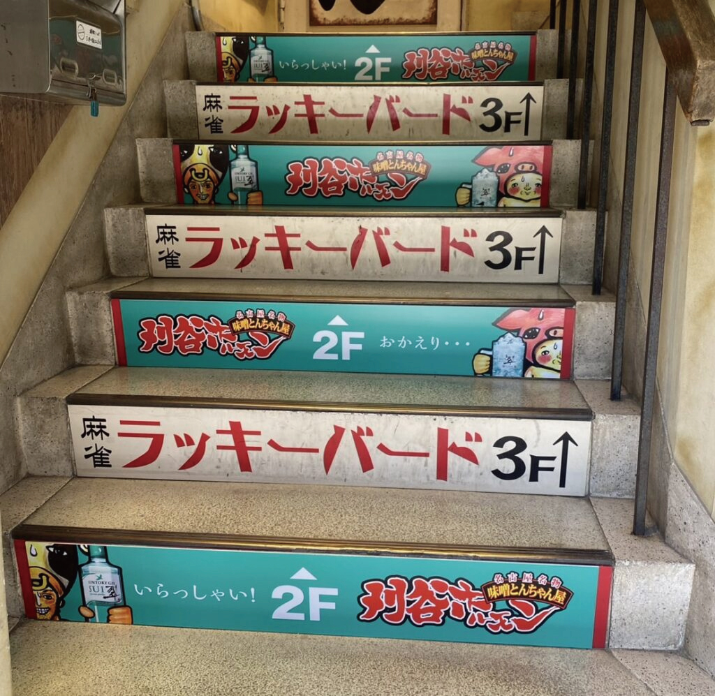 ご依頼をいただいたのは、愛知県刈谷市の飲食店「刈谷ホルモン」様のサイン工事です。打ち合わせを重ねるなかで決まったのが、階段の蹴上(けあげ)部分へのパネル看板設置というプランでした。蹴上はお客様が上り下りするたびに自然と視線が向く場所。ここに統一感のあるサインを設けることで、店内の世界観を演出する重要なポイントになります。素材として選んだのはアルミ複合板のマット仕上げです。軽量でありながら反りにくく、両面テープ4辺での固定でも十分な接着強度が得られるため、階段蹴上という縦面への貼り付けに最適な素材と判断しました。165mm×1000mmという横長フォーマットを6枚(各2枚ずつのデザイン)制作し、巻き込み貼りで仕上げることで端部の浮きを防いだ、こだわりの仕様です。