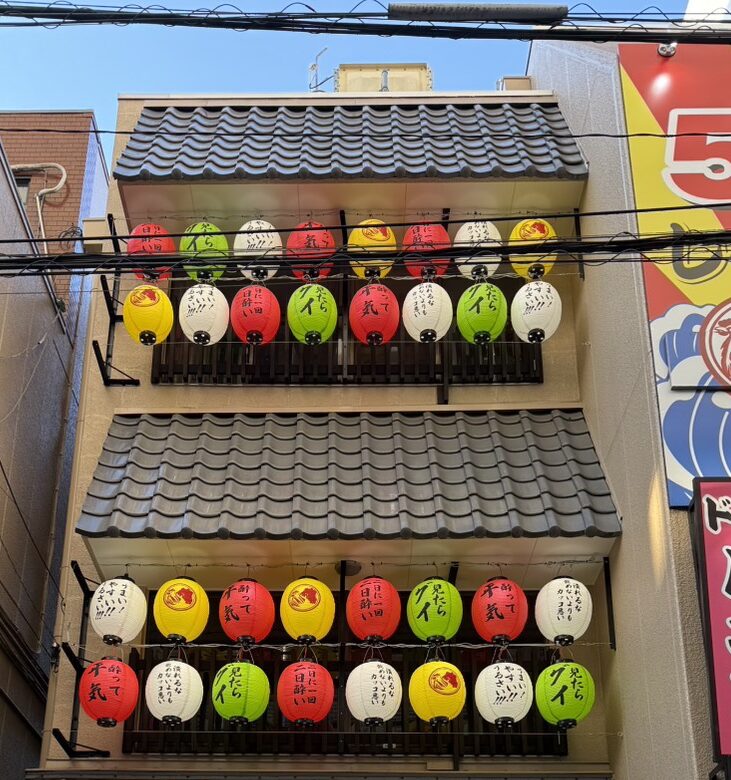 ■提灯装飾(建物上部・電球配線あり) 建物上部に多数の提灯を設置しました。施工内容は以下の通りです。